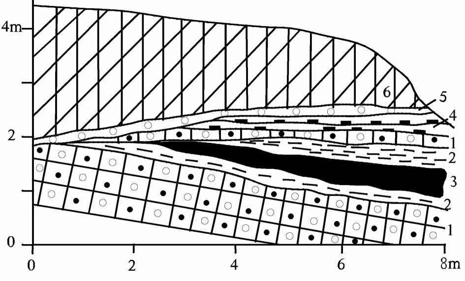 图7 遵义后槽矿区贺家槽采场素描图 1—豆砾状铝土矿; 2—黏土岩; 3—含球状黄铁矿的煤层; 4—炭质黏 土岩; 5—砾岩(砾石由铝土矿组成); 6—致密状铝土矿 Fig.7 Sketch of Hejiacao pit in the Houcao mining area in Zunyi 1-Pisolitic bauxite; 2-Clay rock; 3-Coal seam containing framboidal pyrite; 4-Carbonaceous clay rock; 5-Conglomerate (the composition of the gravel is bauxite); 6-Dense bauxite |