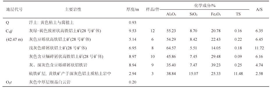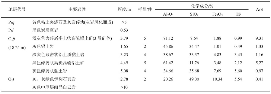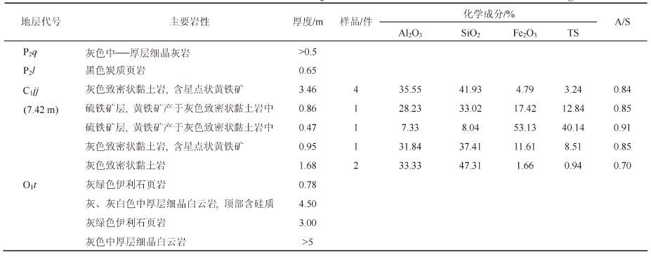 后槽矿区铝土矿及其含矿岩系的岩石地层为下石炭统九架炉组(C1jj)[1, 5],自下而上,主要岩性有伊利石黏土岩、铁质黏土岩、高岭石伊利石黏土岩、各种类型的铝土质黏土岩(简称铝土岩)、铝土矿、时夹黑色炭质岩(如煤、炭质黏土岩、炭质铝土岩、高炭铝土矿)及硫铁矿层等。高铁铝土矿(Fe2O3≥15%,下同)多分布在古地形较高处,低铁铝土矿(Fe2O3≤15%,下同)全分布在古地形较低处[1]。铝土矿含矿岩系的九架炉组主要产于以下奥陶统桐梓组和中上寒武统娄山关群碳酸盐岩为基底的各种溶蚀洼地内。