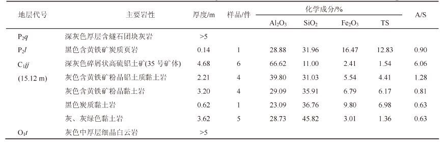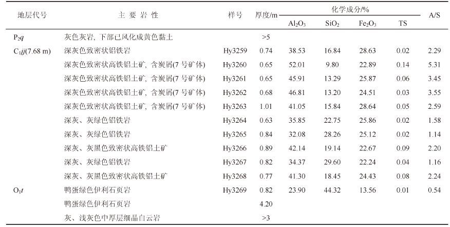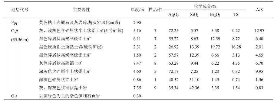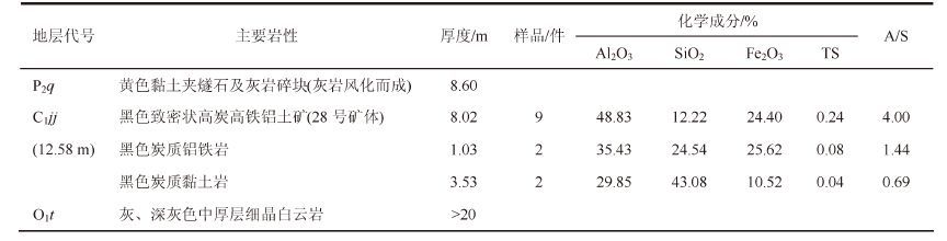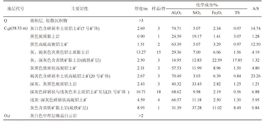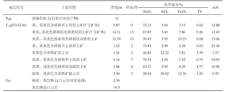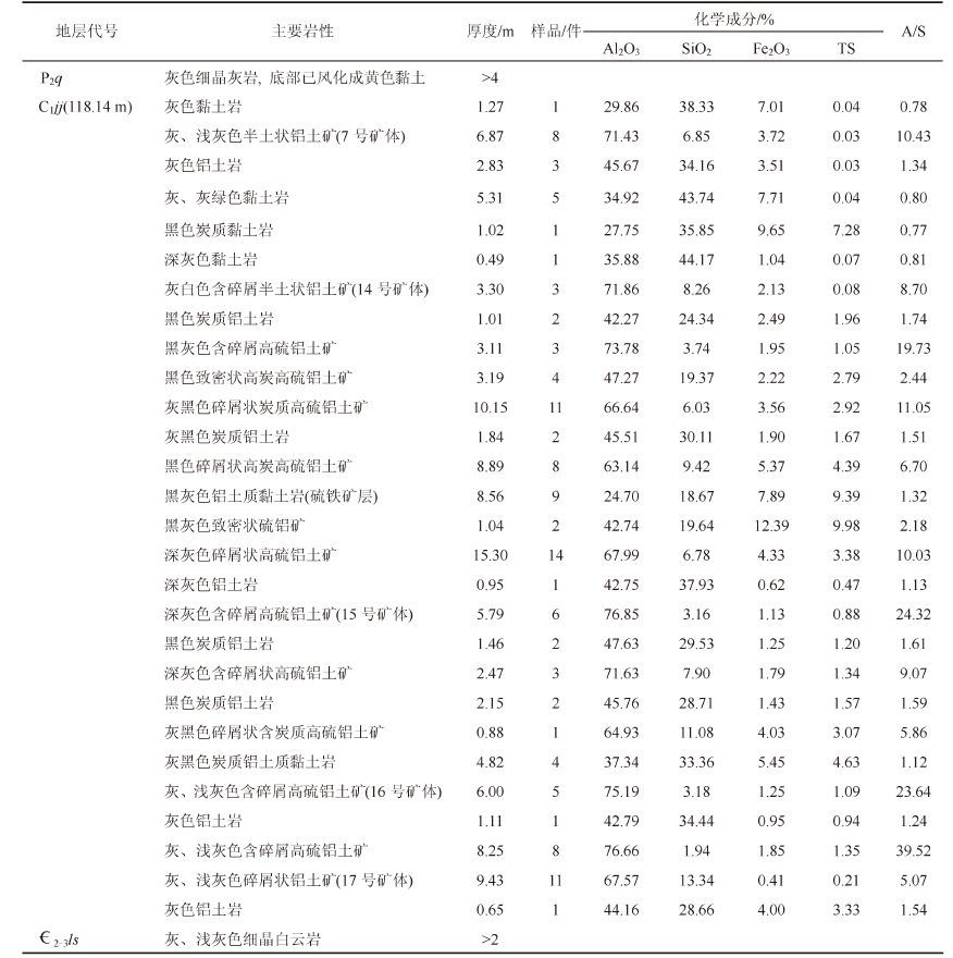 | 表12 后槽矿区铝土矿(30件)化学成分平均含量 Table 12 Average content of bauxite (30 pieces) chemical composition in the Houcao mining area |