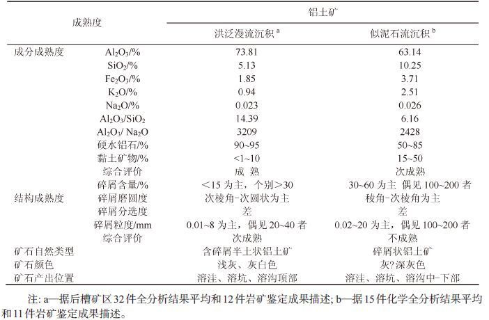 在后槽溶盆内,原始风化壳物质主要是通过冲洪积作用中的似泥石流沉积和洪泛漫流沉积形成含碎屑的铝土矿。这2 种成因形成的铝土矿,既有相近之处,又有明显差别。这里借用碎屑沉积岩的成熟度概念[7],来比较两种成因铝土矿的差异性。表11 列出了洪泛漫流与似泥石流沉积作用形成的铝土矿的主要参数,通过对比得知,无论从成分或是从结构来看,洪泛漫流沉积形成的含碎屑半土状铝土矿的成熟度,均优于似泥石流沉积形成的碎屑状铝土矿。