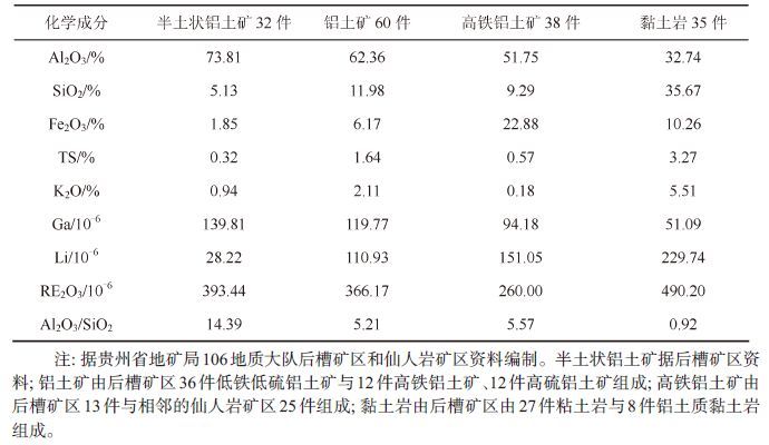 石化学特征据本区各种溶蚀洼地中的30 件低铁铝土矿的化学全分析结果,其平均含量如表12。经过计算,该矿石中Al2O3与TiO2、Ga、Cr、Zr、Nb、Ta 等均呈正相关关系,Al2O3与TiO2的相关系数为0.771,Al2O3与Ga 为0.598,Al2O3与Cr 为0.471,Al2O3与Zr 为0.573,Al2O3 与Nb 为0.735,等。矿石中Al2O3 与SiO2、Fe2O3、TS、K2O、Na2O、MgO、Li、Ba 等呈负相关关系,Al2O3 与SiO2 的相关系数为- 0.726 ,Al2O3 与Fe2O3 为-0.484,Al2O3 与TS 为-0.413,Al2O3 与K2O为- 0.658,Al2O3 与Na2O 为- 0.521,Al2O3 与Li 为-0.535; SiO2与TiO2为-0.759,SiO2与Ga 为-0.517;SiO2与K2O为0.967,SiO2与Li 为0.768,等; RE2O3与任何成分均无相关性[8]。