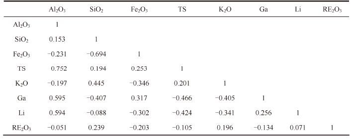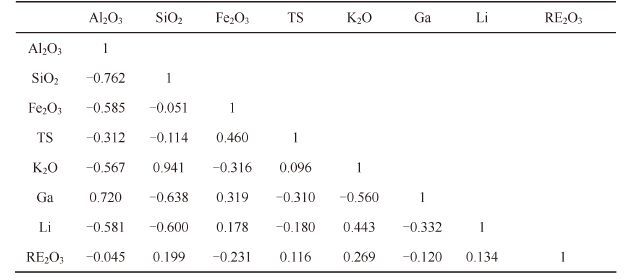 (2) 铝土矿中的SiO2主要在伊利石、高岭石、绿泥石中,Fe2O3主要在赤铁矿、针铁矿、褐铁矿内,或以Fe2+的形式存在于黄铁矿、菱铁矿中; TS 主要在黄铁矿中; K2O、Na2O 大多在伊利石内; CaO、MgO是方解石、白云石的主要成分,MgO在绿泥石中也有分布。当铝土矿成熟度越高、硬水铝石含量越多,黏土矿物、绿泥石、铁矿物、硫矿物、碳酸盐岩矿物就越少,故Al2O3 与SiO2、Fe2O3、TS、K2O、Na2O、MgO、Li等呈负相关。