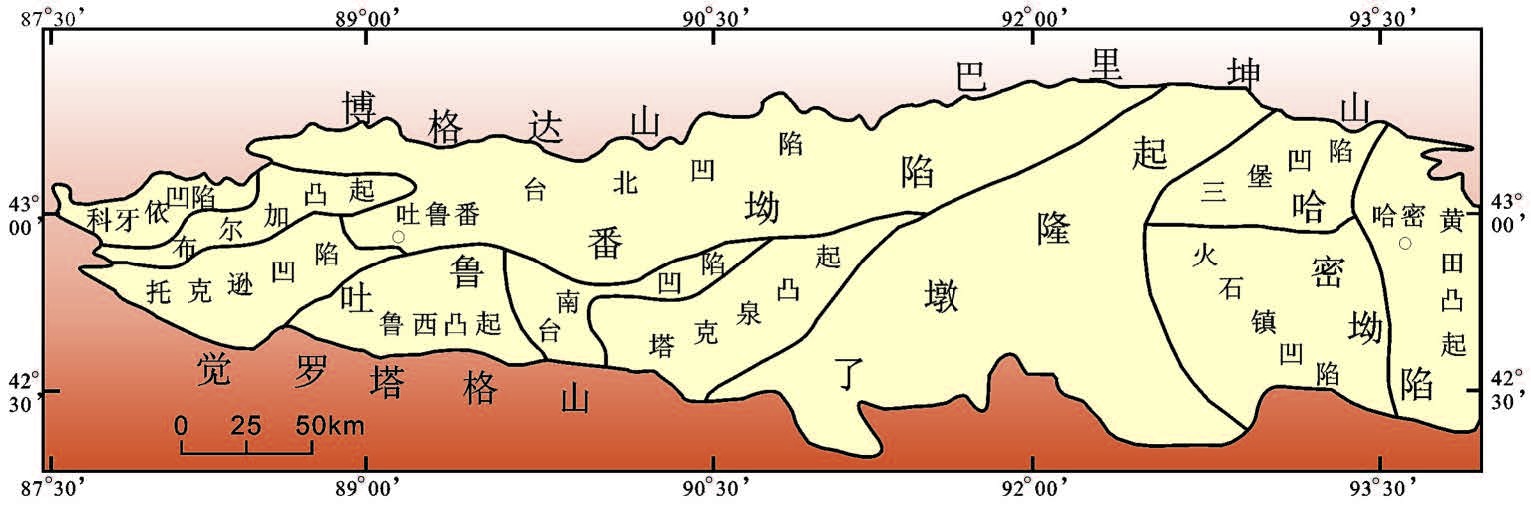 2 地质背景吐哈盆地位于新疆维吾尔自治区东部,整体呈东西向展布,南北分别与塔里木盆地、准噶尔盆地隔山相望。盆地四周环山,西起喀拉乌成山,东至梧桐窝子泉附近,北依博格达山、巴里坤山和哈尔里克山,南抵觉罗塔格山。盆地东西长660 km,南北宽60~100 km,总面积约53500 km2,有效勘探面积约35000 km2[5]。盆地内具有丰富的煤炭、石油、天然气资源。