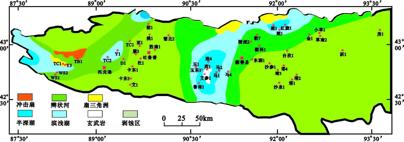 晚三叠世(T3)基本上继承了中三叠世的沉积特征,在区域构造稳定、气候温暖潮湿的背景下广泛发育了扇三角洲和湖泊沉积体系。与克拉玛依组沉积环境相比,为典型的水进体系域沉积,也是三叠纪在吐鲁番坳陷扇三角洲发育的鼎盛时期。在南、北2 个扇三角洲沉积体系之间发育近东西向分布的半深湖—深湖沉积体系,为页岩分布区;哈密坳陷发育了一套由多物源供给形成的扇三角洲扇裙,深湖和半深湖仅局部发育。
