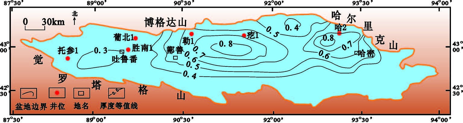 桃东沟群(P2td):上部岩性主要为湖泊相的灰黑色泥页岩、砂岩的互层,是盆地内重要生油岩层系;下部多为块状砂岩,常具较厚的底砾岩。这套地层遭受后期严重剥蚀,桃东沟群残留分布于台南凹陷、台北凹陷中北部、托克逊凹陷中部及哈密坳陷的北部,地层厚度一般为200~600 m。