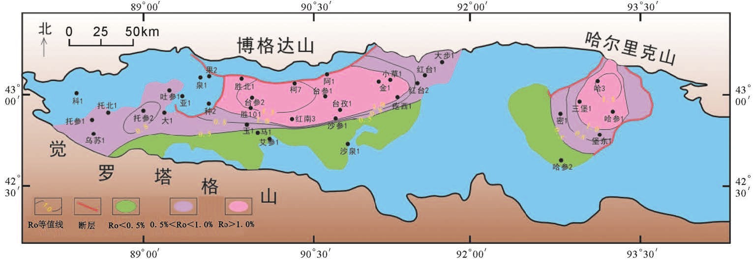 图4 吐哈盆地中上三叠统小泉沟群泥页岩现今Ro等值线图 Fig.4 Middle-Upper Triassic Xiaoquangou Formation shale Ro isogram in Turpan-Hami Basin |