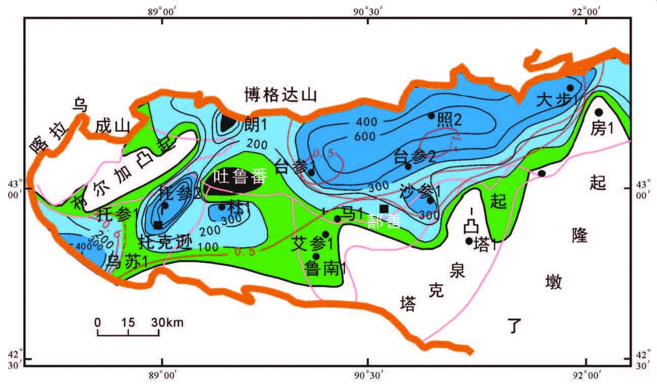 图7 吐哈盆地西山窑组暗色泥岩厚度等值线图(据文献[9]修改) Fig.7 Xishanyao Formation dark mudstone thickness isoline in Turpan-Hami Basin (modified after reference [9]) |
