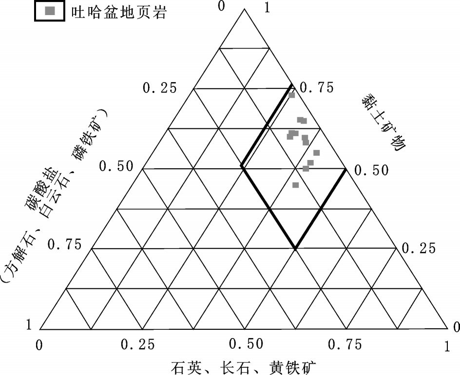 图6 吐哈盆地泥页岩矿物成分三角图(据文献[9]修改) Fig.6 Mineral composition of shale in Turpan-Hami Basin (modified after reference [9]) |