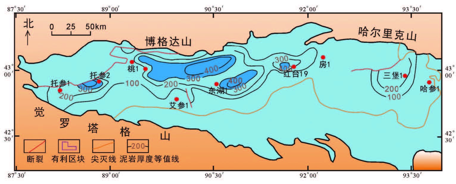中、上三叠统小泉沟群有利区分布于三堡凹陷;桃东沟群有利区分布于台南凹陷、台北凹陷中北部、托克逊凹陷中部及哈密坳陷的北部。