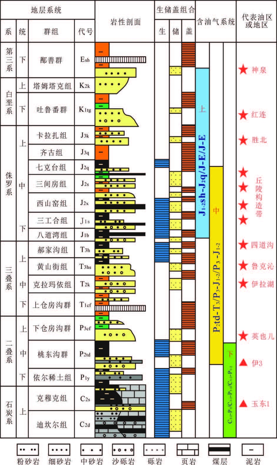 3.1 侏罗系煤系地层侏罗系煤系含油气系统的烃源岩主要为中、下侏罗统水西沟群的煤系地层和七克台组湖相泥岩,但有效的烃源岩主要是水西沟群的八道湾组、三工河组和西山窑组,它们在盆地内广泛分布,其中的烃源岩包括煤层、炭质泥岩和暗色泥岩。