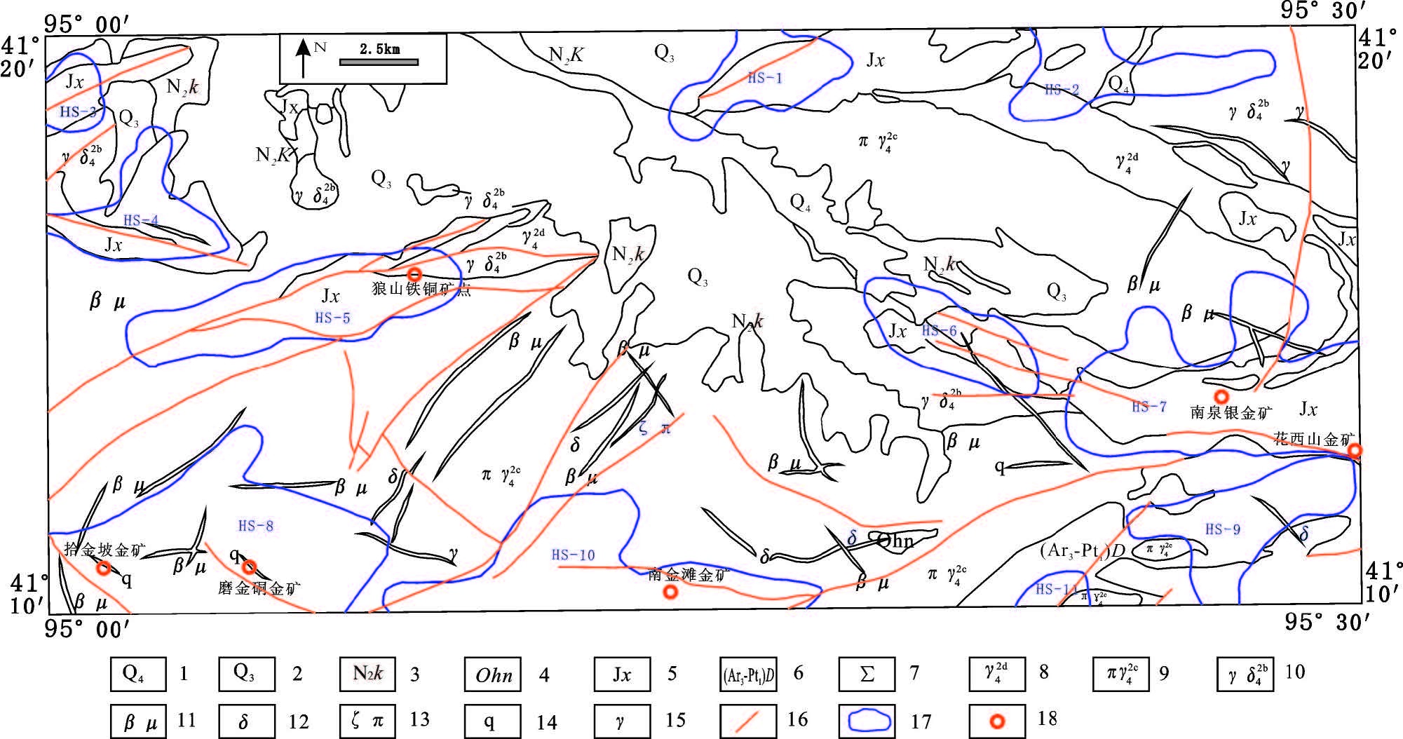 甘肃北山拾金坡—南金滩地区综合异常划分图 1—第四系; 2—古近-新近系; 3—新近系; 4—奥陶系; 5—蓟县系; 6—敦煌群; 7—超基性杂岩; 8—海西中期花岗岩; 9—海西中期斑状花岗岩; 10—海西中期花岗闪长岩; 11—辉绿岩脉; 12—闪长岩脉; 13—英安斑岩脉; 14—石英脉; 15—花岗岩脉; 16—断裂; 17—综合异常及编号; 18—矿床(点) Fig.1 Comprehensive anomalies and prospective area of the study area 1-Quaternary; 2-Paleogene-Neogene; 3-Neogene; 4-Ordovician; 5-Jixianian System; 6-Dunhuang Group; 7-Ultrabasic complex; 8-Middle hercynian granite; 9-Middle hercynian porphyritic granite; 10-Middle hercynian granodiorite; 11-Diabase vein; 12- Diorite vein; 13-Dacite porphyry vein; 14-Quartz vein; 15-Granite vein; 16-Fault; 17-Synthetic anomaly; 18-Deposit (ore spot) |