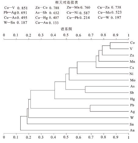 图3 金坡—南金滩地区水系沉积物元素R型聚类 分析谱系图 Fig.3 Cluster analysis diagram of elements from stream sediments in Shijinpo-Nanjintan area |