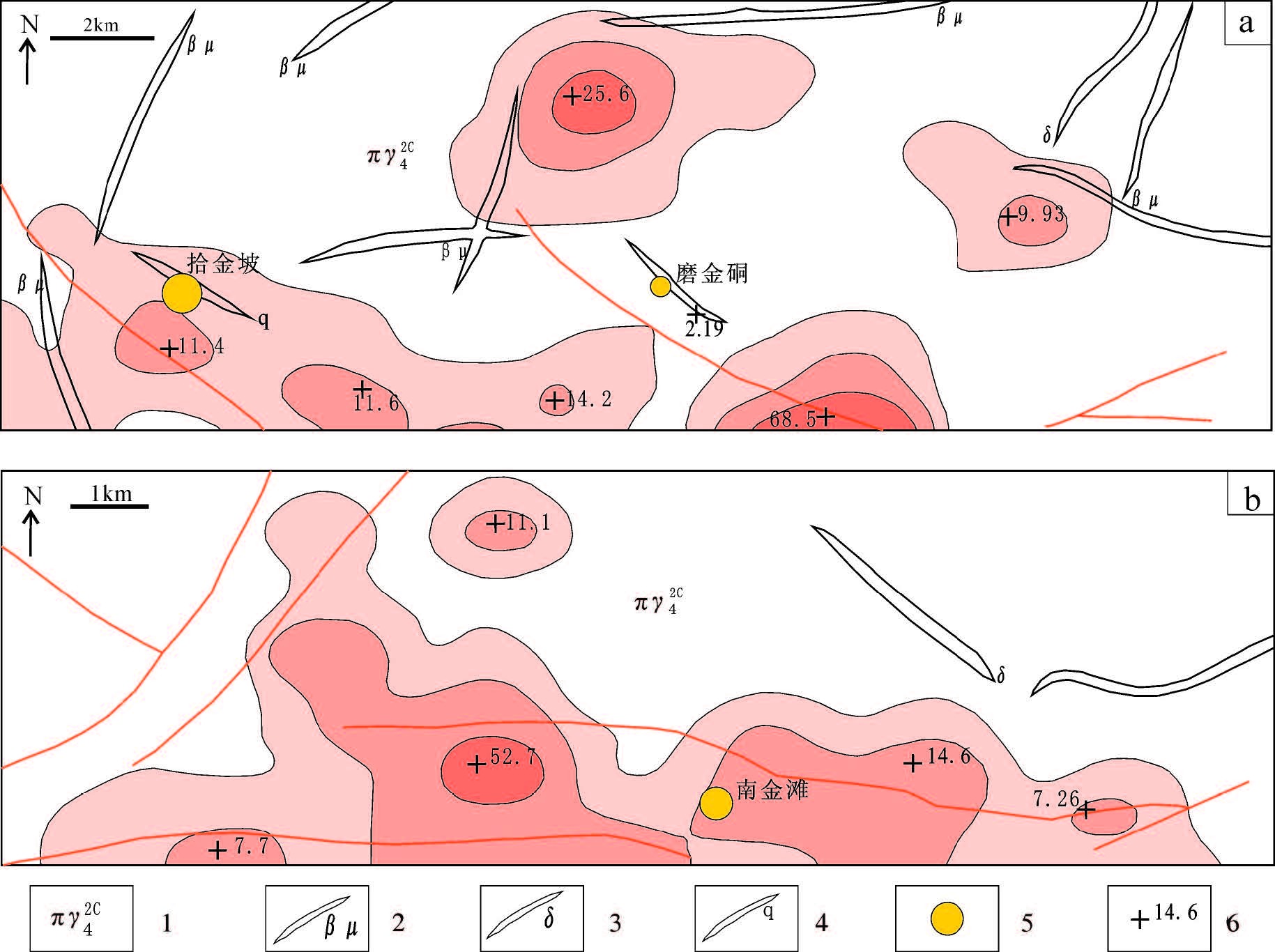 甘肃北山拾金坡—南金滩地区HS-8(a)和HS-10(b)综合异常区Au元素异常解析图 1—海西中期斑状花岗岩; 2—辉绿岩脉; 3—闪长岩脉; 4—石英脉; 5—金矿床; 6—金元素极大值 Fig.4 Anomaly resolution map of No. HS-8 (a) and HS-10 (b) in Shijinpo-Nanjintan area, Beishan Mountain, Gansu Province 1-Middle Hercynian porphyritic granite; 2-Diabase dykes; 3-Diorite vein; 4-Quartz vein; 5-Gold deposit; 6-Maximum of Au |