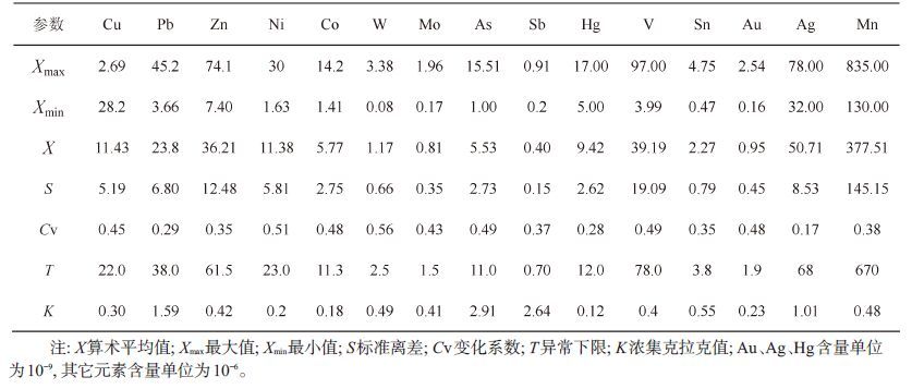 | 表3 拾金坡—南金滩地区水系沉积物指示元素地球化学参数 Table 3 Geochemical parameters of stream sediments in Shijinpo-Nanjintan area |