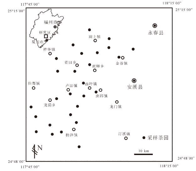 2 样品采集与实验方法2013 年在福建安溪62 处茶园采集了土壤和茶叶样品。本文利用其中27 处茶园样品开展研究,其中16 处为红壤、10 处为赤红壤,1 处为黄红壤。研究区及采样茶园分布见图1。