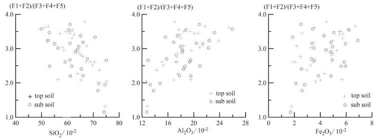 研究区土壤干筛团聚体粒级组成以>250 μm的大团聚体为主,反映了红壤团聚体组成特点。由于红壤富含1∶1 型黏土矿物高岭石、铁铝氧化物等胶结剂,虽然其团聚体化学稳定性较差,但水稳定性极强[6],风干土壤团聚体十分稳定、极难破解。从图2 可见,大团聚体与微团聚体组成的比值,即图中(F1+F2)/(F3+F4+F5)值与土壤SiO2 成反比,而与Al2O3、Fe2O3呈正相关,说明土壤中黏土矿物和铁铝氧化物含量越高,越易形成机械稳定性强的大团聚体颗粒。