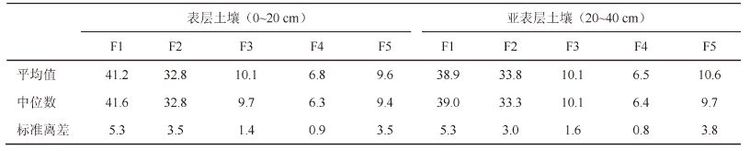 5.3 团聚体粒级对元素提取态浓度的影响由表4 可见,除了水提取态外,无论是表层土壤还是亚表层土壤,采用其他3 种方法的绝大多数元素(不包括Mo、Se)的提取态浓度均随着团聚体颗径变小而逐步递增。例如,微细粒级F5 中As、Cd、Hg、Mn、Ni、Zn元素的NH4NO3提取态浓度达粗粒级F1 提取浓度的1.2 倍以上,微细粒级F5 中As、Cd、Cr、Cu、Hg、Mn、Ni、Pb、Zn 元素的稀盐酸提取态浓度多为粗粒级F1 提取浓度的1.3 倍以上,微细粒级F5 中As、Cd、Cu、Hg、Mo、Ni、Pb、Zn 元素的稀盐酸提取态浓度也多在粗粒级F1 提取浓度的1.3 倍以上。土壤微细团聚体中元素提取态浓度高于粗粒级的结果,意味着结合于土壤扬尘、地表径流侵蚀携带的微细土壤颗粒中重金属生物有效性相对较高,土壤重金属污染生态风险评价时应加以关注。