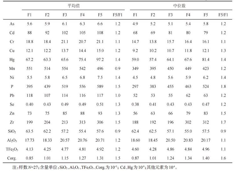 4 土壤元素的团聚体分配特征表3 为27 个茶园表层土壤5 个粒级组元素浓度平均值和中位数。可见,27 件表层茶园土壤中绝大多数元素的浓度随土壤粒级大小呈现规律性递变趋势,这种变化可由粒级元素浓度的比值(F5/F1)来体现。对比表层茶园土壤各团聚体粒级元素浓度(表3)可见:(1)除了SiO2外,其他元素均不同程度地表现为细粒级浓度高于粗粒级的特征,其中P、Zn、Zr、Corg 明显富集于细粒级(F5∶F1≥1.5),这与欧洲一些城市土壤潜在毒性元素富集在<10 μm细粒级中的规律相似[14],也与四川雅安茶园土壤有机碳随团聚体粒径的变化规律相同[39]。多数元素浓度不仅从粗粒级(F1)向细粒级(F5)逐渐上升,而且微团聚体F3、F4、F5 浓度与大团聚体F1、F2 浓度存在明显的含量台阶,以Cd、Cr、Hg、Ni、P、Al2O3 最为明显。土壤大团聚体和微团聚体中常量组成SiO2、Al2O3、Fe2O3的明显差异,意味着其矿物组成的可能差异;(2)SiO2具有不同于其他元素的粒级分配规律,在粗粒级中浓度明显高于细粒级。对样品进行目视检验,发现F1和F2主要为机械稳定性强的胶结难破解团聚体,并含有少量原生矿物,主要为抗风化能力强的石英颗粒。亚表层茶园土壤元素浓度的粒级变化规律与表层土壤基本相同,不再细述。