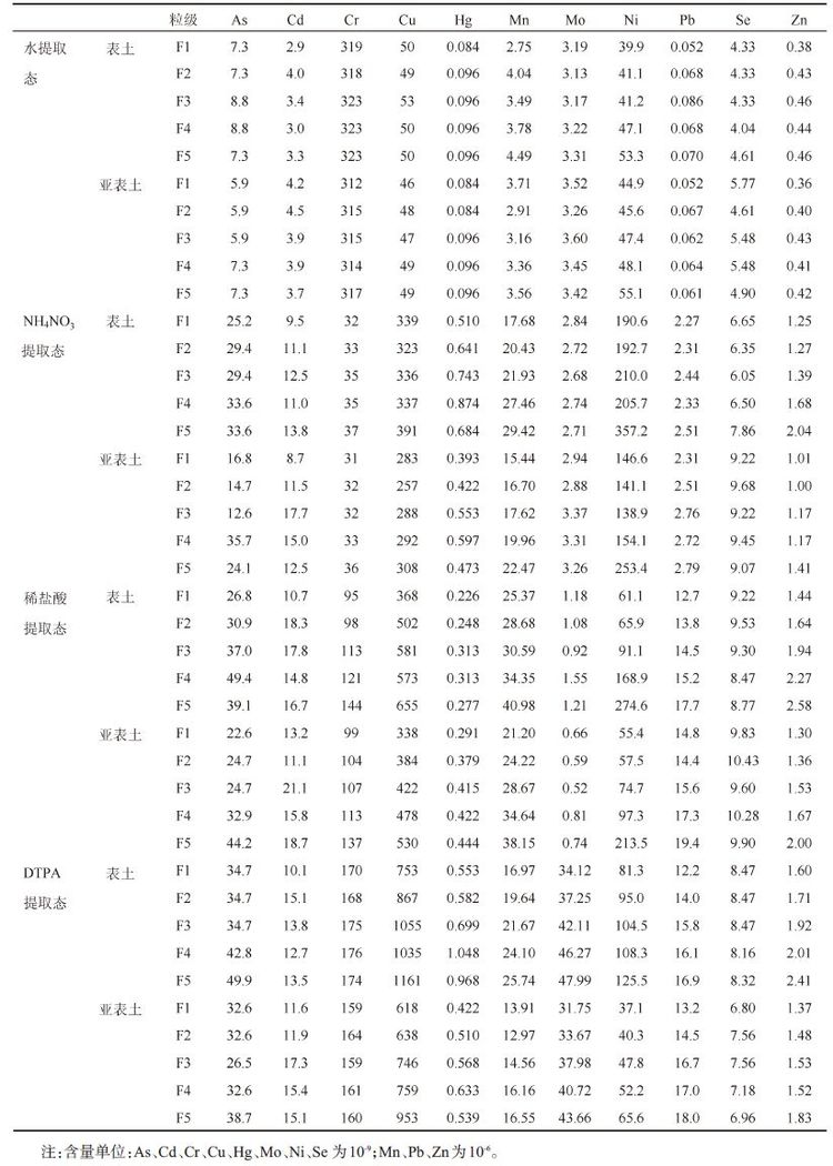 重金属浸提和测试方法。称取5 g 土壤粒级样4 份,分别加入50 mL去离子水、0.1 mol/L 的CaCl2、0.1 mol/L 的稀盐酸、DTPA 浸提液(0.005 mol/L 的DTPA(二乙基三胺五乙酸)+0.01 mol/L 的CaCl2+0.1 mol/L 的TEA(三乙醇胺)),在(25±5)℃室温下提取24 h(期间手动摇匀3~4 次)。在离心机上8000 r/min 离心2 min,分取清液用于元素含量测定。采用等离子体质谱法(ICP-MS)测定浸提液中Cd、Cr、Cu、Mn、Mo、Ni、Pb、Zn 含量,采用原子荧光光谱法(AFS)测定As、Hg、Se含量。