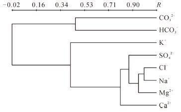 化学元素的离子半径、化合价、存在形态等具有相似性,它们在植物、土壤、沉积物等生命和非生命体中存在一定的相关性[18]。本文采用R型聚类分析对土壤盐分离子的8 个量化指标之间的关系进行了研究(图3),可以看出,按照相关系数值为0.45 作为分类标准,8 个盐分离子可以分为3 类,Ⅰ 类:CO32-、HCO3-; Ⅱ 类: K+; Ⅲ 类: Cl-、Na+、Mg2+、SO42-、Ca2+。其中Cl-和Na+相关性达0.99,说明天津滨海地区土壤中阳离子以Na+为主,阴离子以Cl-为主,尤其在浅层地下水矿化度显著偏高(达盐水程度)的地区,土壤易溶盐中Na+、Cl-所占比例具有绝对优势,具有滨海盐土的基本发生特征。