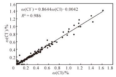 图4 土壤全Cl与易溶盐Cl-含量散点图 Fig.4 The content scatter diagram of soil total Cl and soluble salt Cl- |