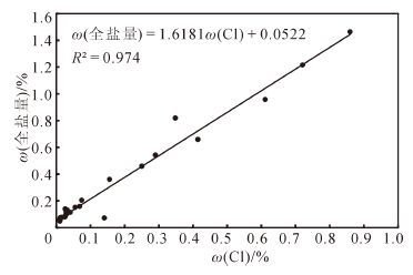 图5 抽稀试验中土壤全Cl与全盐量含量的散点图 Fig.5 The content scatter diagram of soil total Cl and total salt content in thinning test |