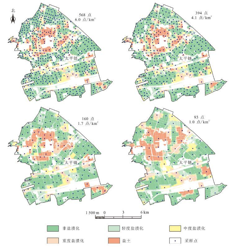 图8 各采样密度下样点分布及盐渍化评价图 Fig.8 The chart of sample distribution and salinization evaluation in different sampling densities |