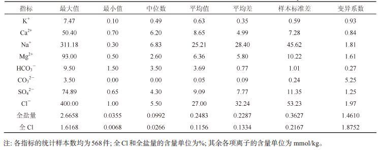 3.2 样品测试本文所及样品测试项目为土壤全Cl、全盐量及8 项易溶盐离子(Na+、K+、Ca2+、Mg2+、HCO3-、CO32-、SO42-和Cl-),样品测试单位为国土资源部天津矿产资源监督检测中心。土壤全Cl 利用X射线荧光光谱法(XRF)测定; 全盐量采用水浴蒸干法测定; Na+、K+、Ca2+、Mg2+和SO42-采用等离子体发射光谱法(ICP-AES) 测定; HCO3- 、CO32- 和Cl- 采用容量法(VOL)测定。测试过程中均采用了标准样、密码样、监控样等多种监控手段保障测试质量。各指标测试结果统计特征见表1。