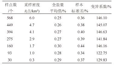 | 表2 不同采样密度全盐量变异系数统计 Table 2 Statistics of variation coefficients of total salinities in different sampling densities |