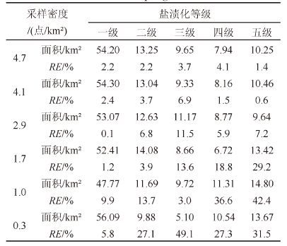 | 表5 不同采样密度各盐渍化等级面积的相对误差 Table 5 The relative errors of the salinization level area in different sampling densities |