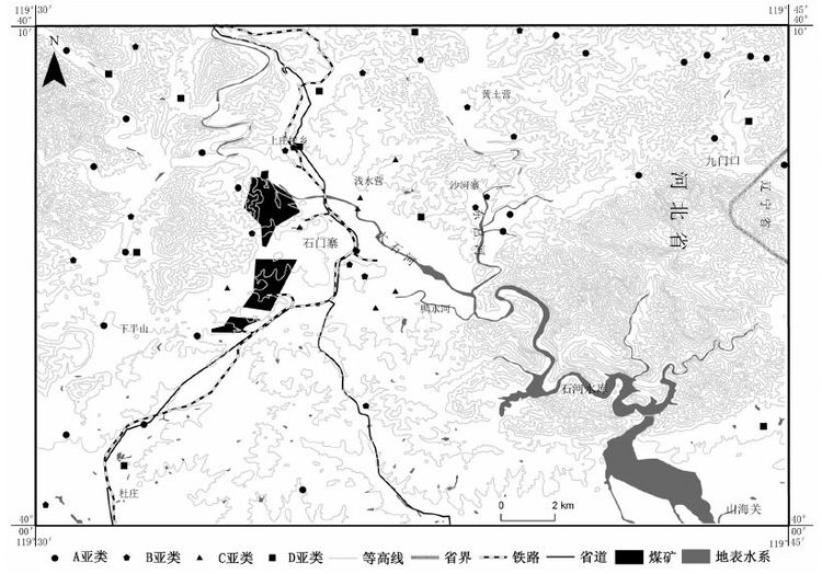根据4 亚类采样点位置图图10 可知,A亚类和 B亚类主要分布在基岩山区及其边缘,人为活动影 响相对较弱。C亚类的采样点主要分布在煤矿区附 近或者矿坑水排水渠附近。D亚类的采样点均分布 在地势较为平坦的地区,而该类地区人口居住相对 密集,农业种植广泛。结合HCA各个集群的数据特 征和主成分分析的分析结果,推断HCA的四个亚类 地下水的主要影响因素。A亚类代表着补给区低 TDS地下水主要接受大气降水的影响,存在着较弱 水岩交换作用。B亚类地下水水质主要是受到水岩 作用的影响,中等TDS。C亚类地下水主要是受到 研究区南北走向的煤层的影响,化学特征表现为高 SO42-和TDS,煤层中硫铁矿的氧化为主要形成机 制[38]。D亚类中的地下水水质主要是受到人为活动 的影响,农业化肥的过量施用、居民生活污水与垃 圾粪便的下渗污染和其他人类活动影响使得地下 水中NO3-和Cl-含量异常增高。根据2013 年柳江盆 地野外调查分析,初步可判断地下水水中的NO3-和 Cl-的异常增高可能来自于研究区居民生活污水与 垃圾粪便的下渗污染,而NO3-、K+和SO42-含量相对 较高,与研究区广泛的农业种植施氮肥、硫酸钾等 肥料的密切影响。综上,可以确定D亚类异常为人 为影响导致,应予以剔除。