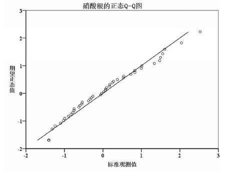 在数据异常值剔除之后,判断数据所服从的分 布类型,运用夏皮洛-威尔克检验(Shapiro-Wilk)、 柯尔莫哥洛夫-斯米尔诺夫( Kolmogorov-Smirnov) 法、偏度峰度法以及Q-Q图法对比试算和 综合判断,上述方法均能判断硝酸盐数据的分布类型。拟推荐Kolmogorov-Smirnov 法和Q-Q 图法 进行综合验证数据的分布类型。Kolmogorov-Smirnov 法是一种拟合优度的检验方法,Q-Q图法 通过Q-Q图直观地判断数据的分布类型。取显著 性水平α 值为0.05,运用SPSS19(中文版)选择硝酸 盐数据进行Kolmogorov-Smirnov 法检验是否满足 正态分布,计算出z 值为0.6,P 值为0.84>0.05,不拒 绝原假设,认为数据服从正态分布。根据经异常值 剔除后硝酸盐数据的正态Q-Q图,图上的点近似地 在一条直线附近,可以判断数据服从正态分布,见 图11。综上,经异常值剔除后的硝酸盐数据服从正 态分布。