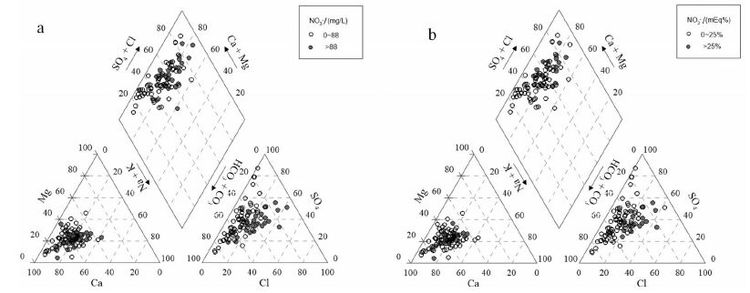 图3 地下水Piper三线图 a—NO3-含量;b—NO3- 毫克当量百分数a-the concentration of NO3-; b-the milliequivalent percentile of NO3- Fig.3 Groundwater piper trilinear diagram: |