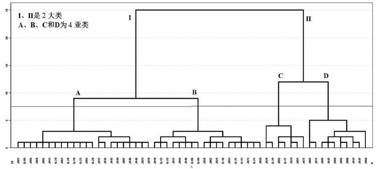 HCA使用离差平方和法根据分割距离欧式距 离的平方把数据分成不同数量的集群,见图5。由 树状图,HCA先将总体样本数据分成了Ⅰ 和Ⅱ 两个 主要的水质类型。Ⅰ 类中有40 组水样,占总样本数 的70.2%,Ⅰ 类又分为A和B两亚类。Ⅱ 类中有水样 17组,占总量的29.8%,Ⅱ 类又分为C和D两亚类。