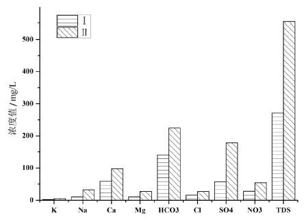 HCA运用离差平方和法区分出的Ⅰ 和Ⅱ 两类,Ⅱ 类TDS中位数特征值是Ⅰ 类的2 倍,Ⅱ 类各主要离子 中位数特征值浓度均远高于Ⅰ 类,Ⅰ 和Ⅱ 两类的主要 水化学类型分别为HCO3-SO4-Ca 和SO4-HCO3-Ca-Mg,见表1 和图6。根据Ⅰ 类和Ⅱ 类的水化学特 征,Ⅰ 类主要反映受大气降雨和微弱的水岩作用控 制的补给区低TDS的浅层地下水,各主要离子的浓 度均相对较低。Ⅱ 类中各离子浓度相对较高,主要 径流区或者径流-排泄区地下水水岩作用较为强烈 的中高TDS的地下水。Ⅱ 类中SO42-集中特征值较Ⅰ 类高出数倍,说明Ⅱ 类中部分地下水采样点受研究 区煤层的影响和较强的水岩作用。Ⅱ 类中Cl-和 NO3-相对较高,反映了Ⅱ 类中的采样点可能受到了 人为活动的影响。