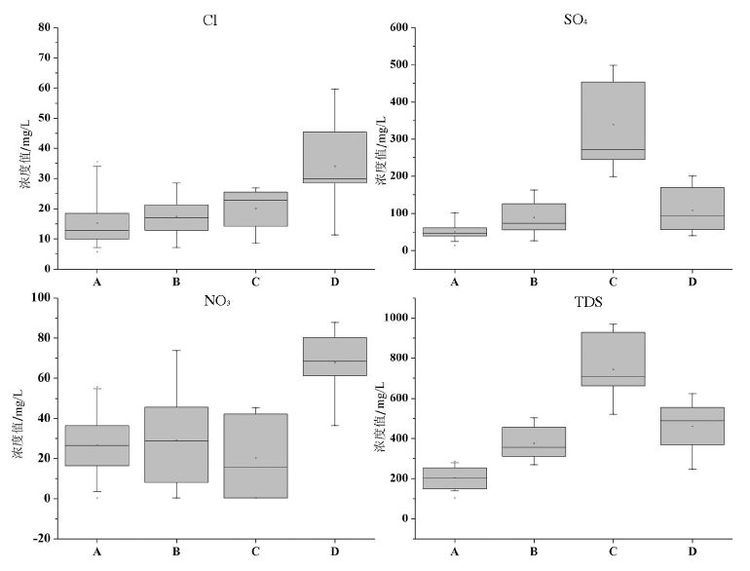 图7 4 亚类Cl、SO4、NO3和TDS的箱型图 Fig.7 The box figure of Cl, SO4, NO3 and TDS of four subclasses |