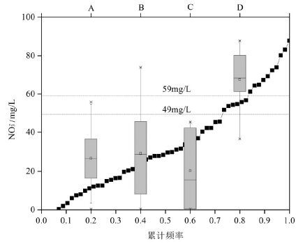 根据NO3-的累计频率曲线,易发现存在着2 个 拐点,分别在NO3-浓度为49.0 mg/L 和59.0 mg/L 处。D亚类主要分布在累计频率曲线图解法的阈值 之外,说明D亚类地下水NO3-存在着异常,A亚类、B 亚类和C 亚类主要分布在59.0 mg/L 之下。累计 频率曲线图解法的阈值与HCA分析的异常亚类基 本相符,见图8。