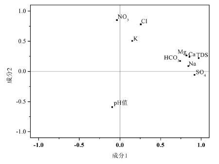 运用主成分分析分析柳江盆地浅层地下水的 主要影响因素。主成分分析取特征值大于1 和旋转 迭代的最大方差法,最大化主成分的方差是为了找 出能说明地下水水化学进程的因素[37]。主成分分析 对进行HCA的57 组数据进行分析,2 个主要成分所 解释的方差的累积贡献率为67.1%,代表了57 组数 据的大部分信息,见图9。成分1 主要的正得分变量 有TDS、SO42-、Ca2+、Na+、Mg2+和HCO3-,得分为负的 仅有NO3-和pH值且负影响非常微弱,表明成分1 代 表着地下水水岩作用的程度。成分2 主要的正得分 变量为NO3-和Cl-,pH值为主要的负得分,TDS、K+、 Na+、Ca2+、Mg2+和HCO3-正得分较小且正影响非常微 弱,这说明成分2 代表着人为因素对地下水的影响 程度。