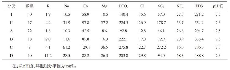 Ⅰ 类区分出来的A和B 2 个亚类,这两亚类的主 要水化学类型均为HCO3-SO4-Ca,对比A和B 2 个 亚类各主要变量,易发现B亚类中TDS普遍高于A 亚类,HCO3-、SO42-和Ca2+离子的含量在B亚类也普 遍高于A亚类,A亚类为低TDS地下水,B亚类为中 低TDS地下水。Ⅱ 类区分出的C和D两个亚类,而 这2 亚类的主要水化学类型分别为SO4-HCO3-Ca 和HCO3-SO4-Ca-Mg。C亚类中的SO42-和TDS在 四个亚类中为最高,为中高等TDS地下水。而D亚 类中的Cl-和NO3-含量最大,D亚类TDS 与B 亚类 比较相近,均为中低TDS地下水,但是D亚类中Cl- 和NO3-含量相对高出许多,说明D亚类存在着一定 的异常性,见表1和图7。