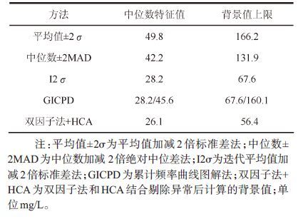 4.3 对比分析为了对比分析双因子法和HCA法结合计算地下 水硝酸盐背景值的可靠程度,运用平均值加减2倍标 准差(平均值±2σ)、中位数加减2倍绝对中位差(中位 数±2MAD)、迭代平均值加减2倍标准差(Ⅰ2σ)和累计 频率曲线图解法(GICPD)4 种数理学方法对91 组地 下水硝酸盐数据进行异常值分析剔除,取95 百分位 数作为背景值上限,计算结果见表2。